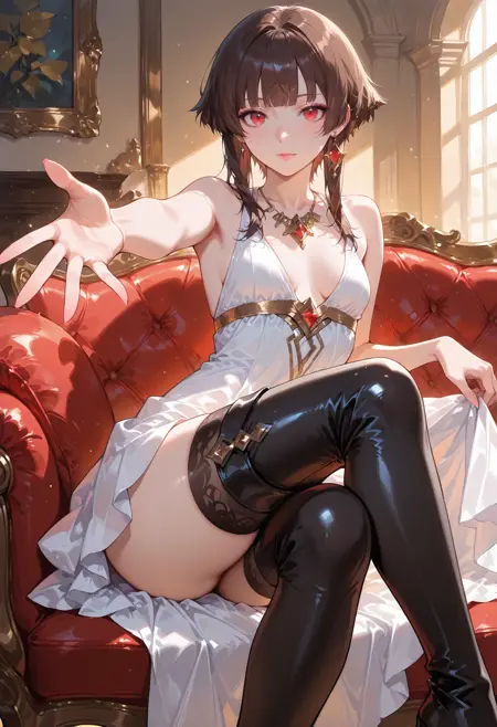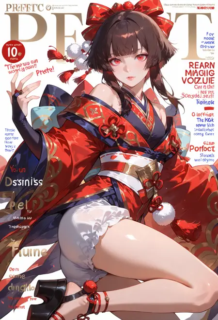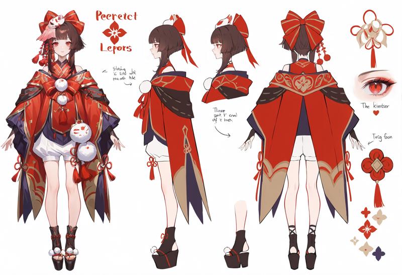 안녕 귀여워 스킨: 긴 머리, 머리장식, 플랫폼 신발, 활, 머리에 달린 활, 펌프(옷), 넓은 소매, 긴 소매, 흰색 반바지, 빨간 활, 털 장식, 게타, 일본 복장, 모래신, 반바지, 검은 신발, 신부 장갑, 플랫폼 힐, 어깨 노출