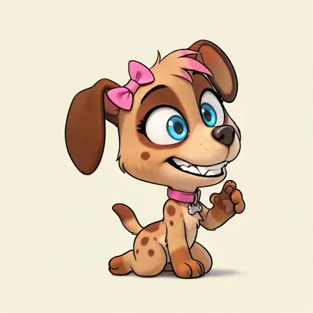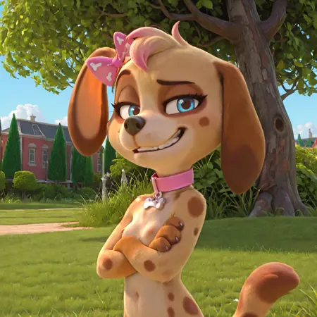 dog, female, tan fur, brown fur, spotted fur, blue eyes, eyelashes, black nose, dark eye spots