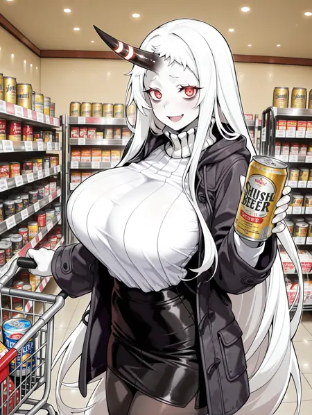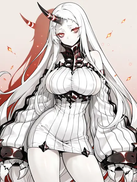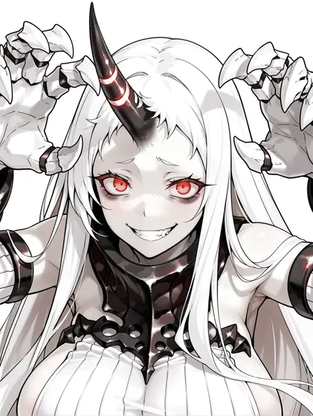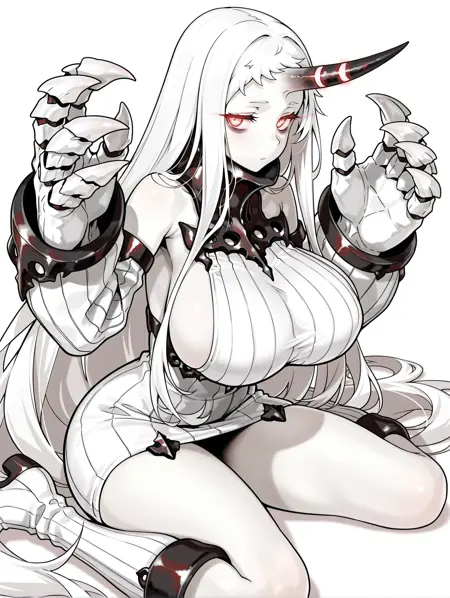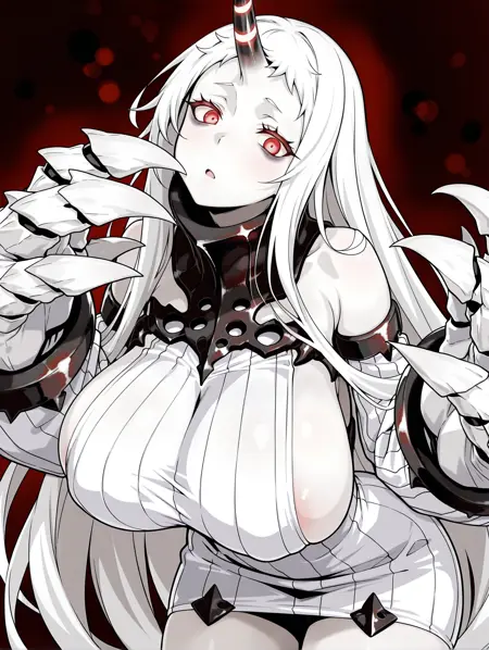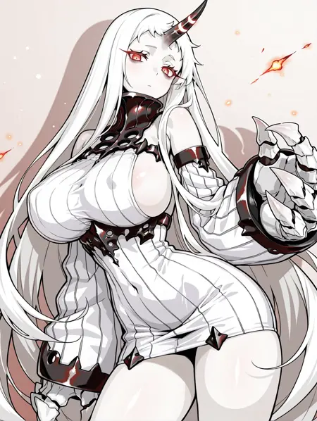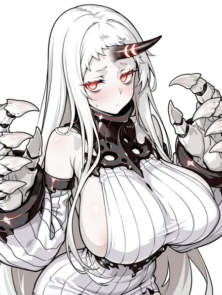 トリガーワード ・s_p,single horn,white hair,red eyes,very long hair,bangs,huge claws,huge breasts,bags under eyes,white_skin,abyssal ship,pale skin,