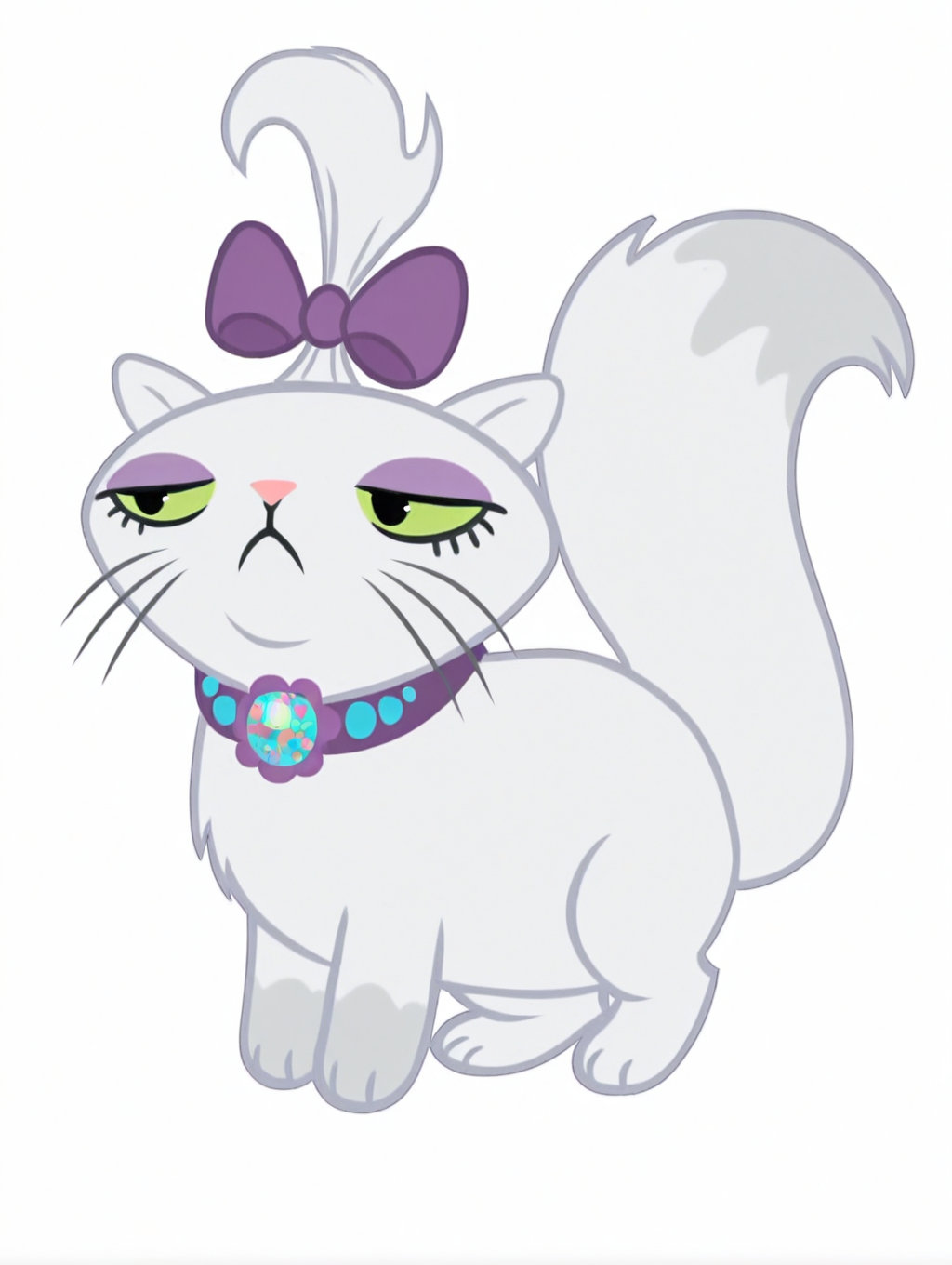 Opalescence, persian cat, cat, :< , solo, animalization, green eyes, whiskers, closed mouth, full body, bow, purple bow, no humans