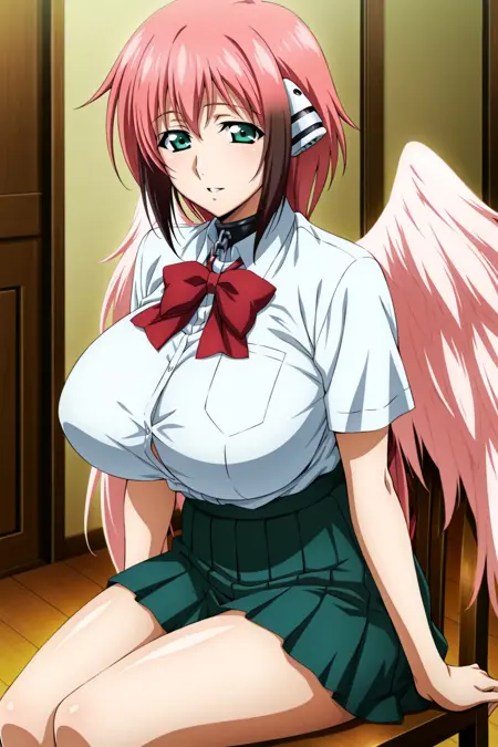 흰색 날개, 흰색 드레스, 젖꼭지 노출, 주름 치마, 팔보호대, 흰색 허벅지 양말,