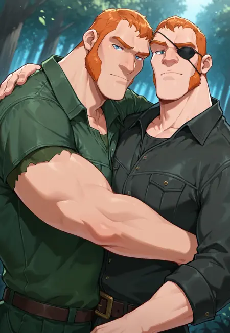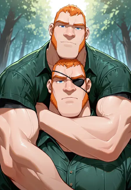 orange hair, short hair, facial hair, sideburns, green shirt, sleeveless, bracers,