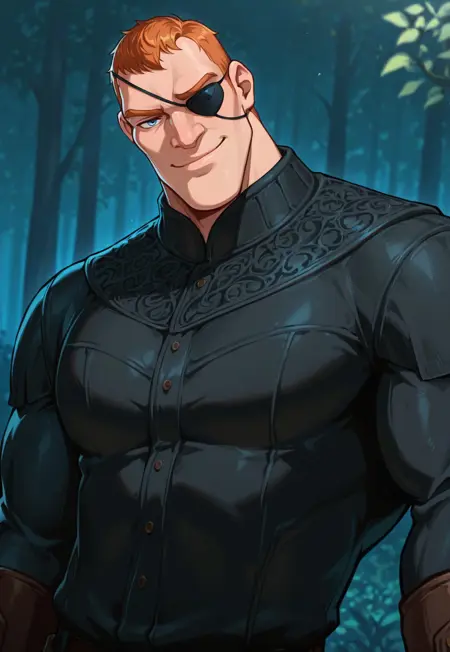 オレンジ色の髪、短い髪、アイパッチ、黒いシャツ、長袖、