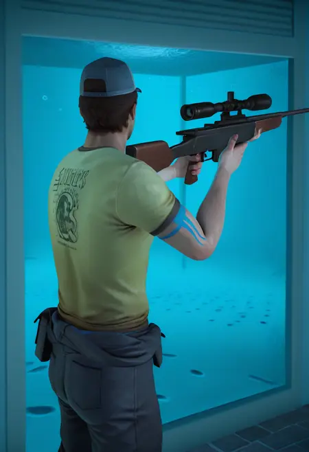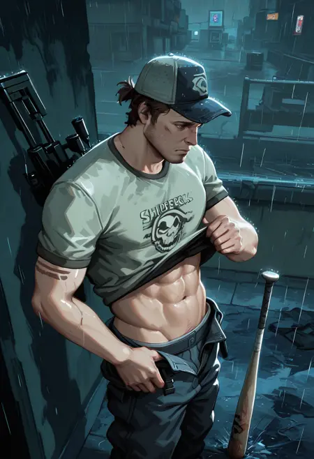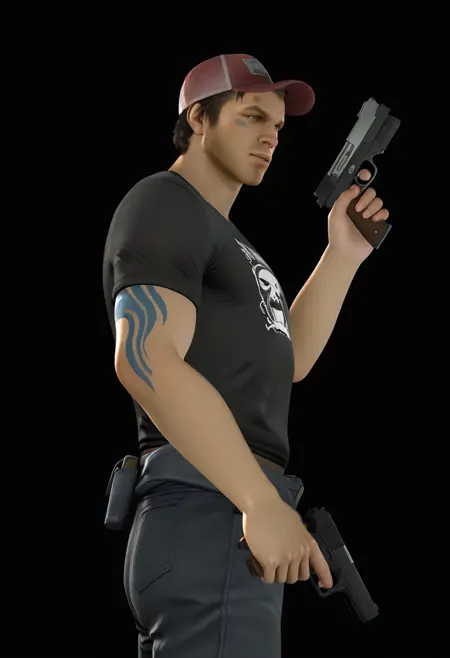 Ellis_L4D2, 디지털 페인팅, 반리얼리스틱, 화가 스타일, 거친 붓질, 음영 있는 색상, 콘셉트 아트, 거친 분위기, 남성 중심, 무기 들고 있음, 영화적 조명, 만화 스타일, 서양 미술 스타일, 1남자, 무기, 티셔츠, 모자, 남성 중심,