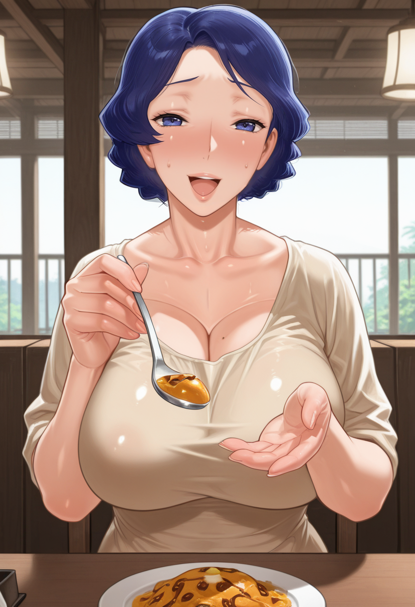 Leona, 1girl, solo, mature female, blue hair, short hair, blue eyes, huge breasts,