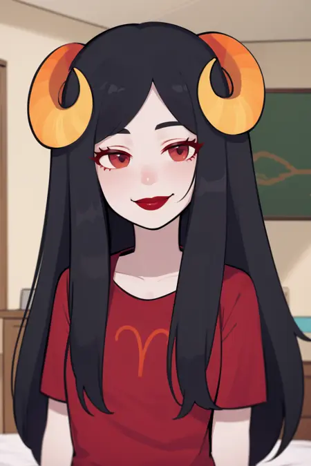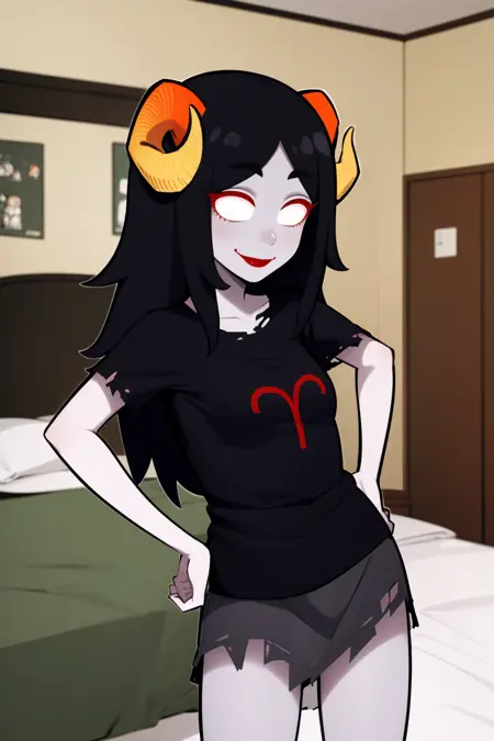 其他提示词:1girl, black hair, long hair, grey skin, colored skin, makeup, lipstick, black shirt, grey skirt