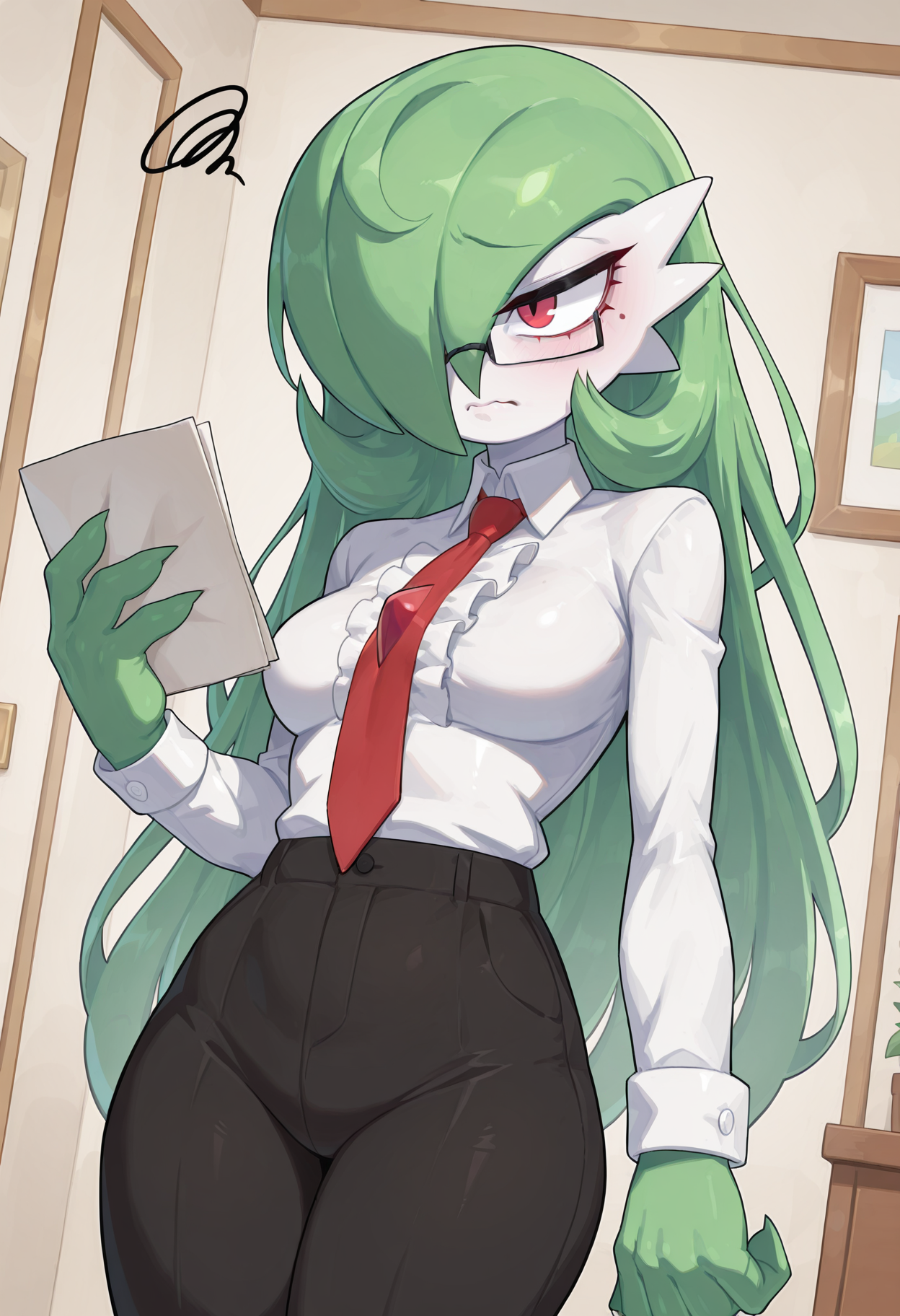 multicolored skin, white skin, green hair, long hair, red eyes, mole under eye, red chest gem, hair over one eye