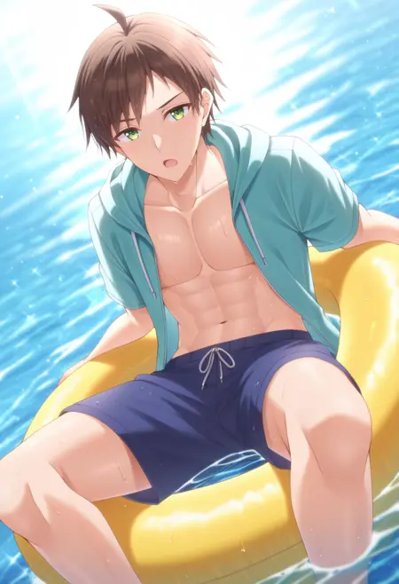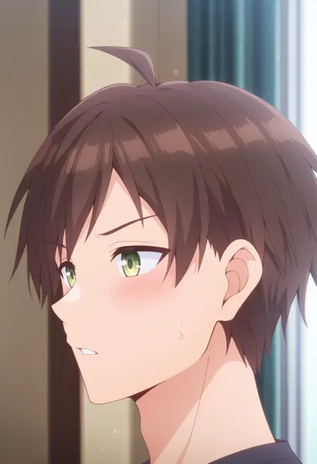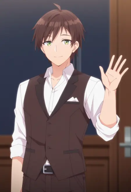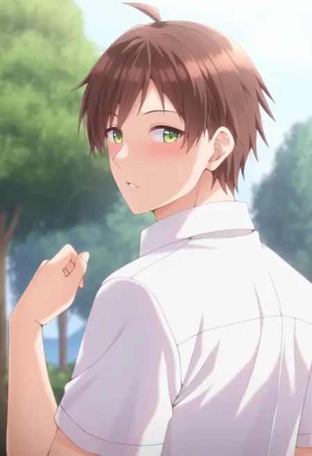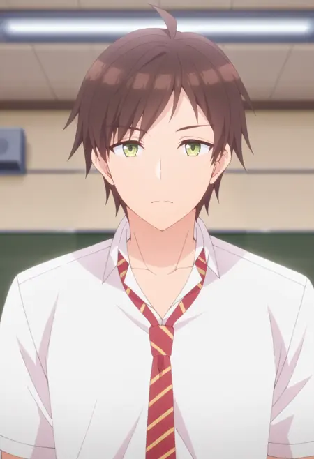 akiteru, brown hair,green eyes, short hair, ahoge