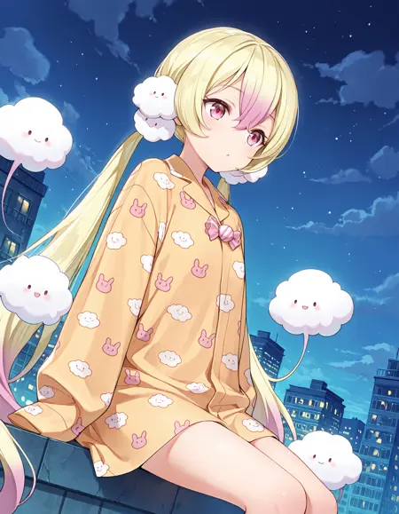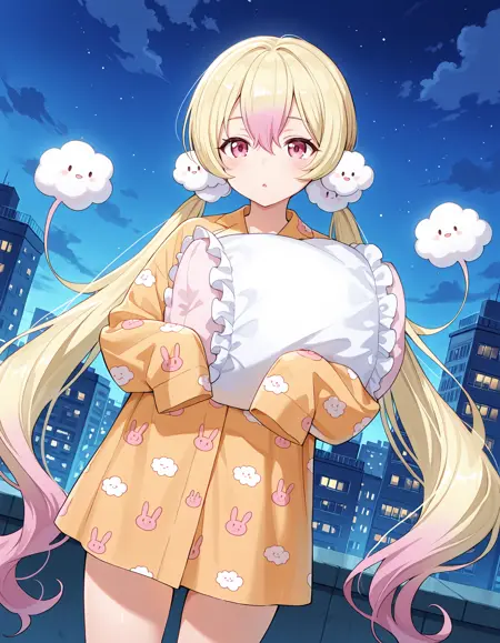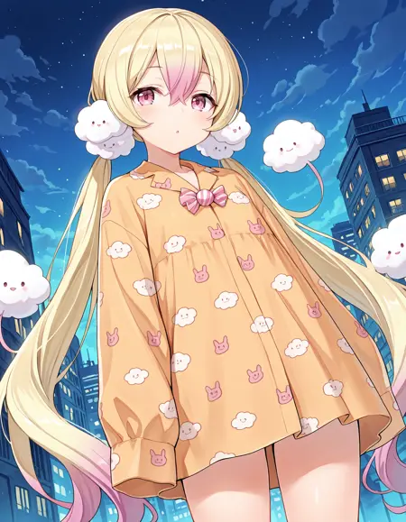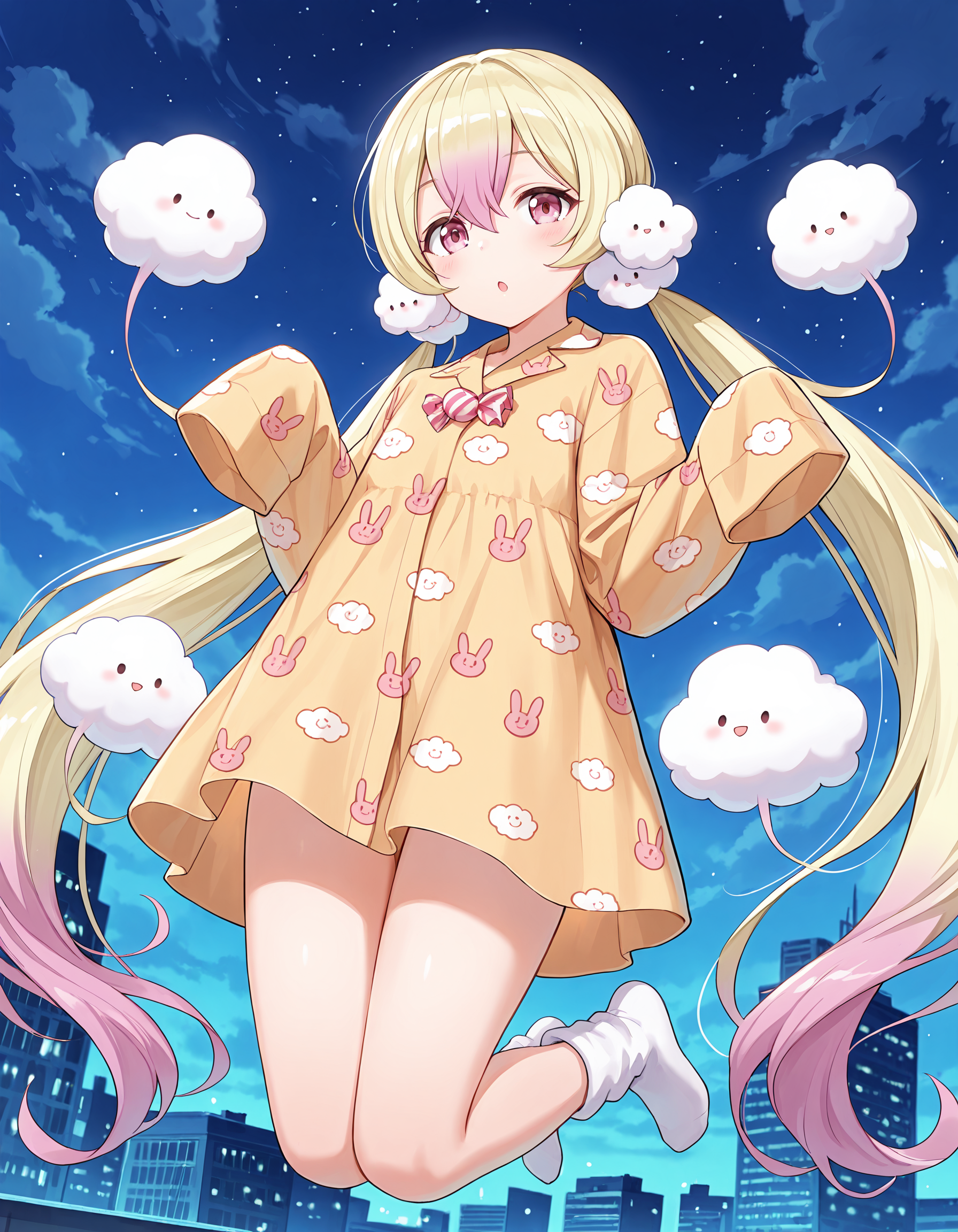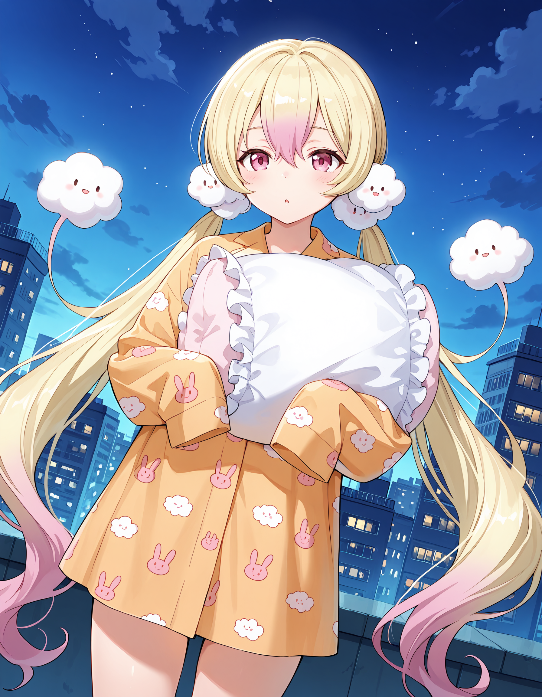 rcnemurin, 날리는 머리카락, 매우 긴 머리카락, 이색 머리카락, 그라데이션 머리카락, 눈 사이의 머리카락, 낮은 트윈테일, 구름 모양 머리 장식, 분홍색 눈