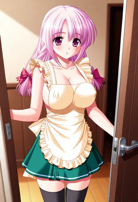 2 거의 벌거벗은 앞치마, 연한 노란색 앞치마, 젖꼭지 가린 상태, 녹색 치마, 주름치마, 검은 허벅지 양말