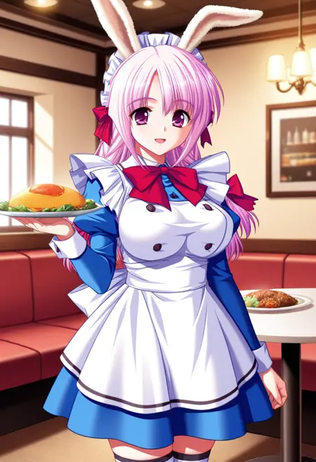 4 털로 된 토끼 귀, 메이드 헤드장식, 빨간 리본넥타이, 파란색 드레스, 퍼프 소매, 긴 소매, 흰색 앞치마, 줄무늬 허벅지 양말