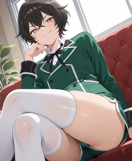 Regular outfit: school uniform,green double-breasted blazer,white trim,black cuffs,white shirt under,black ribbon bow tie,green shorts,brown boots,dagger,