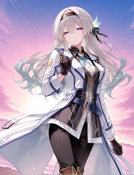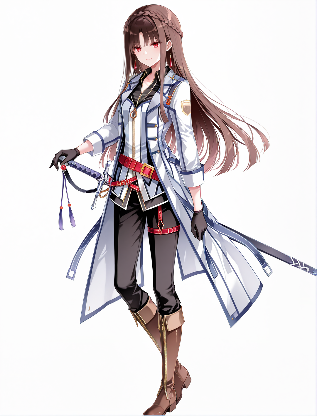 Rean(cs3outfit),white coat,long coat,belt,white shirt,open coat,zipper,black vest,black gloves,black pants,boots,brown footwear,knee boots,