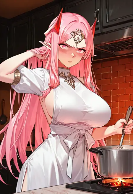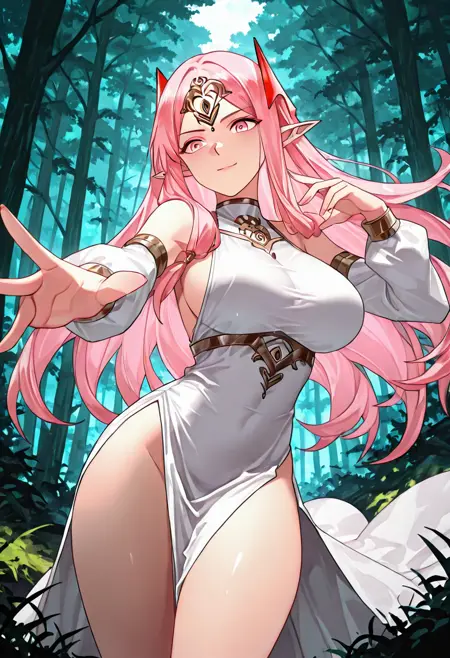 ,yu ru meng,yu ru meng,1girl,solo,pointy ears,pink hair,breasts,long hair,pink eyes,large breasts,white dress,