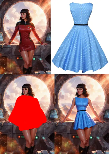 이 모든 트릭은 이미지의 특정 영역을 빨간색으로 표시한 후(블롭 또는 사각형만으로 충분), 그 영역에 맞는 추가 이미지(예: 얼굴)를 전달하고 마법의 단어 "빨간 영역 제거"라고 말하는 것입니다. 가련한 Qwen은 선택의 여지가 없고, 빨간 블롭의 위치에 무언가를 넣어야 합니다.