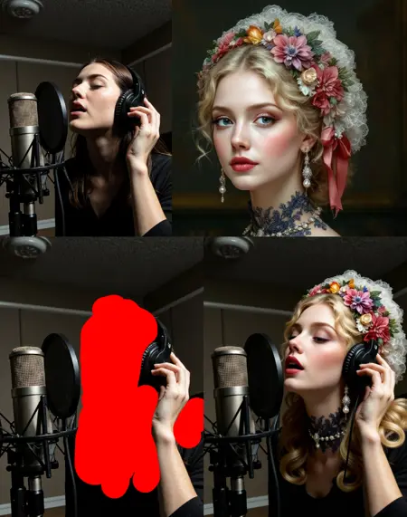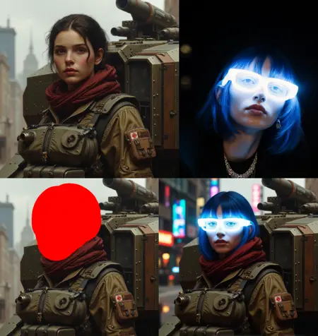 Whole trick is around marking some area in image in red color (just blob, square) passing additional image that would fit into that area (like face) and telling magic word "remove red area". Poor Qwen don't have a choice and have to put something in a place of red blob.