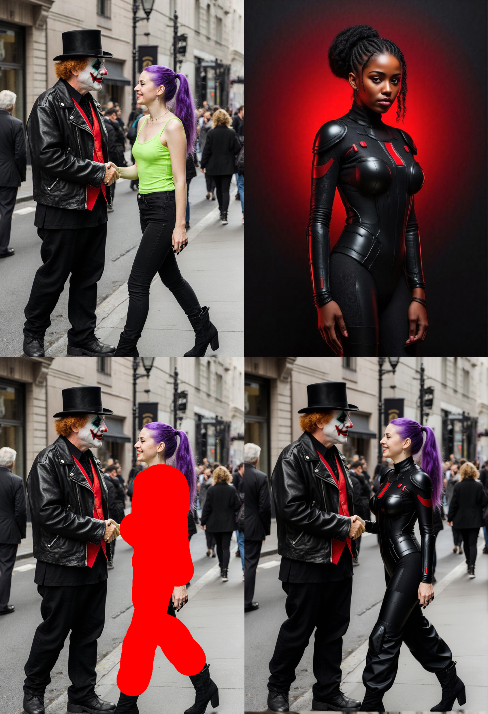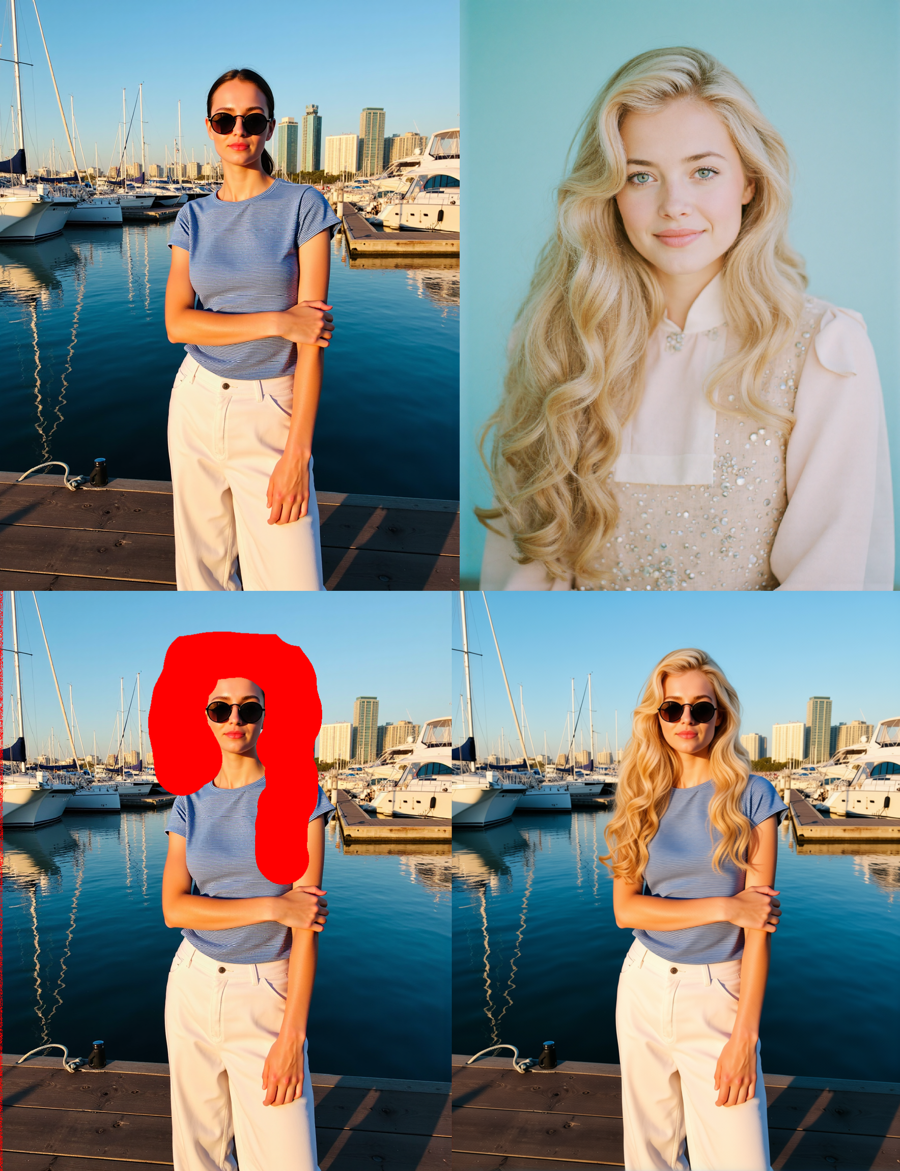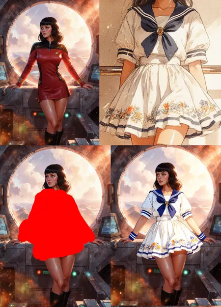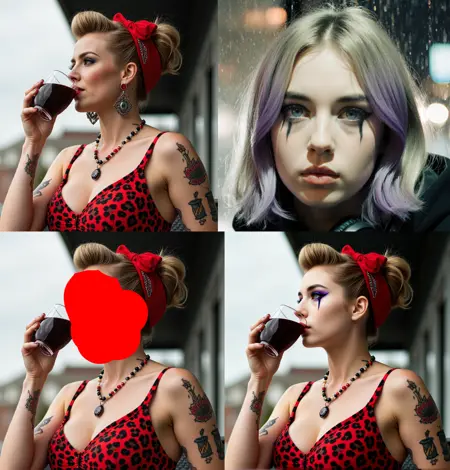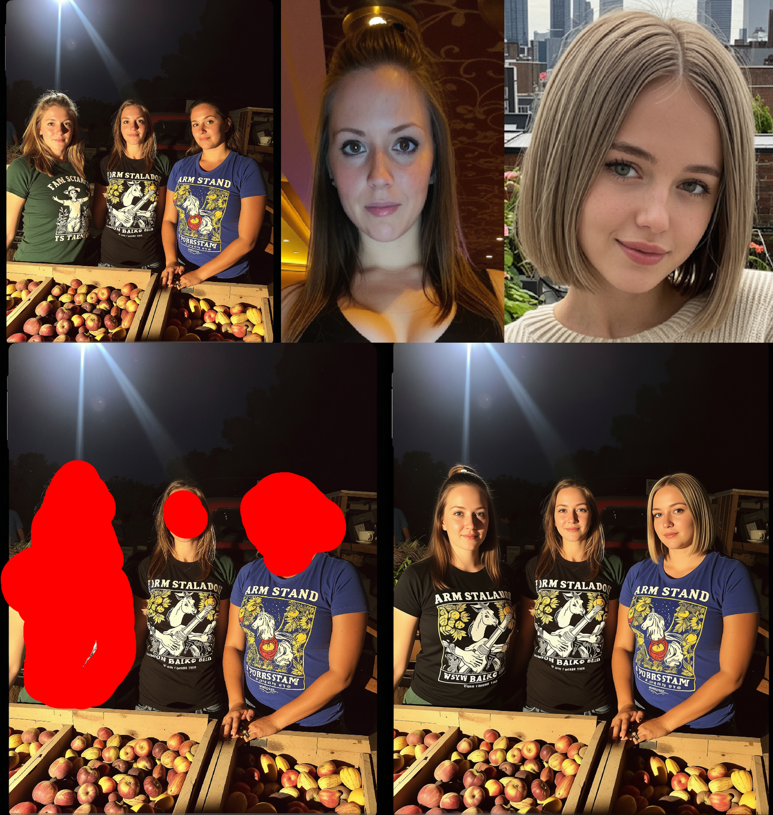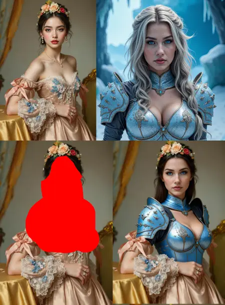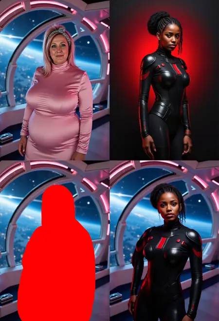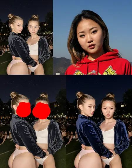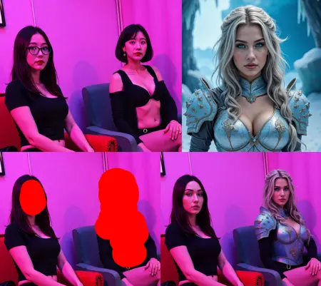 Whole trick is around marking some area in image in red color (just blob, square) passing additional image that would fit into that area (like face) and telling magic word "remove red area". Poor Qwen don't have a choice and have to put something in a place of red blob.