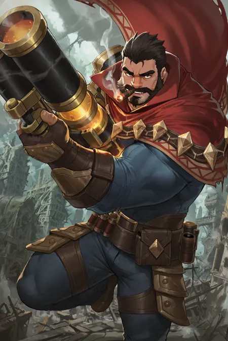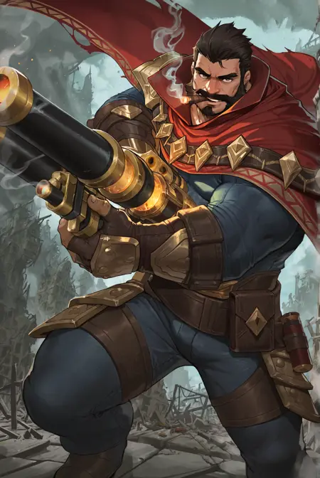 gr4ves, graves \(league of legends\), mature male, muscular, short hair, black hair, facial hair, beard, mustache, cape, red cape, armor, gloves, belt, pants, jeans