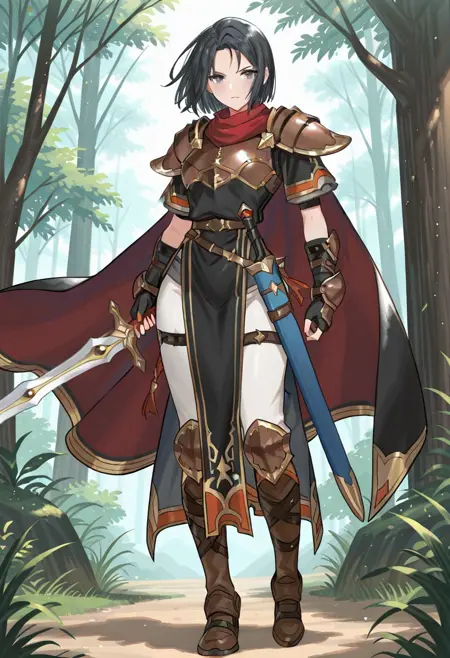 トリガーワード:1girl、グレーの目、黒髪、短髪、赤いスカーフ、鎧、肩甲板、手甲、胸板、マント、黒いシャツ、短めの袖、白いズボン、ブーツ、骨盤カーテン、金縁、フィンガーレスグローブ、剣、鞘
