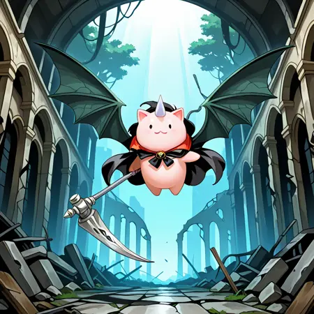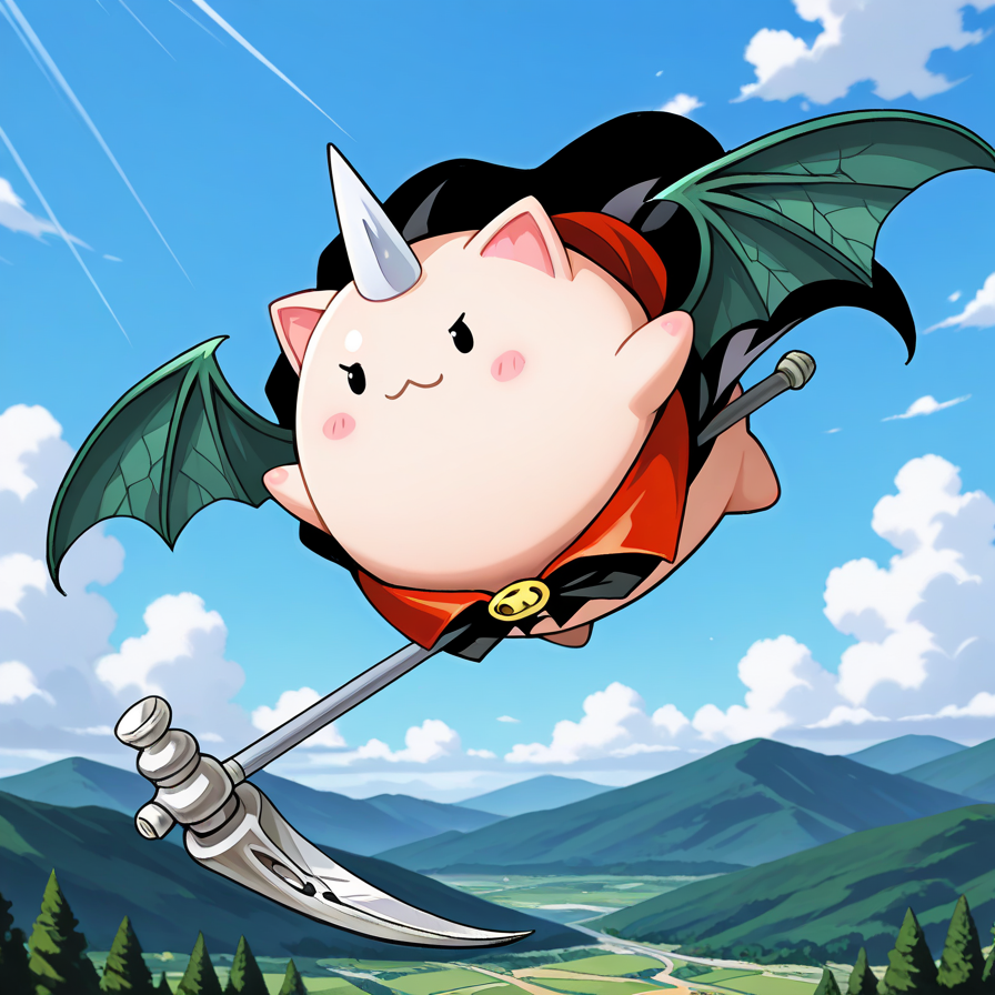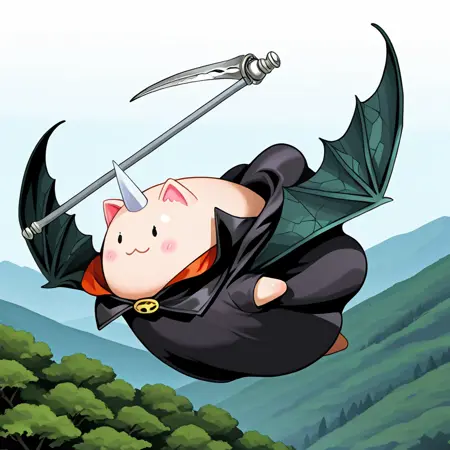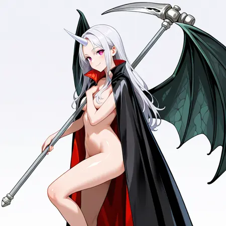 Daimao\(alicesoft\),1other,:3,black eyes,single horn,wings,black cloak,silver scythe,polearm,holding weapon