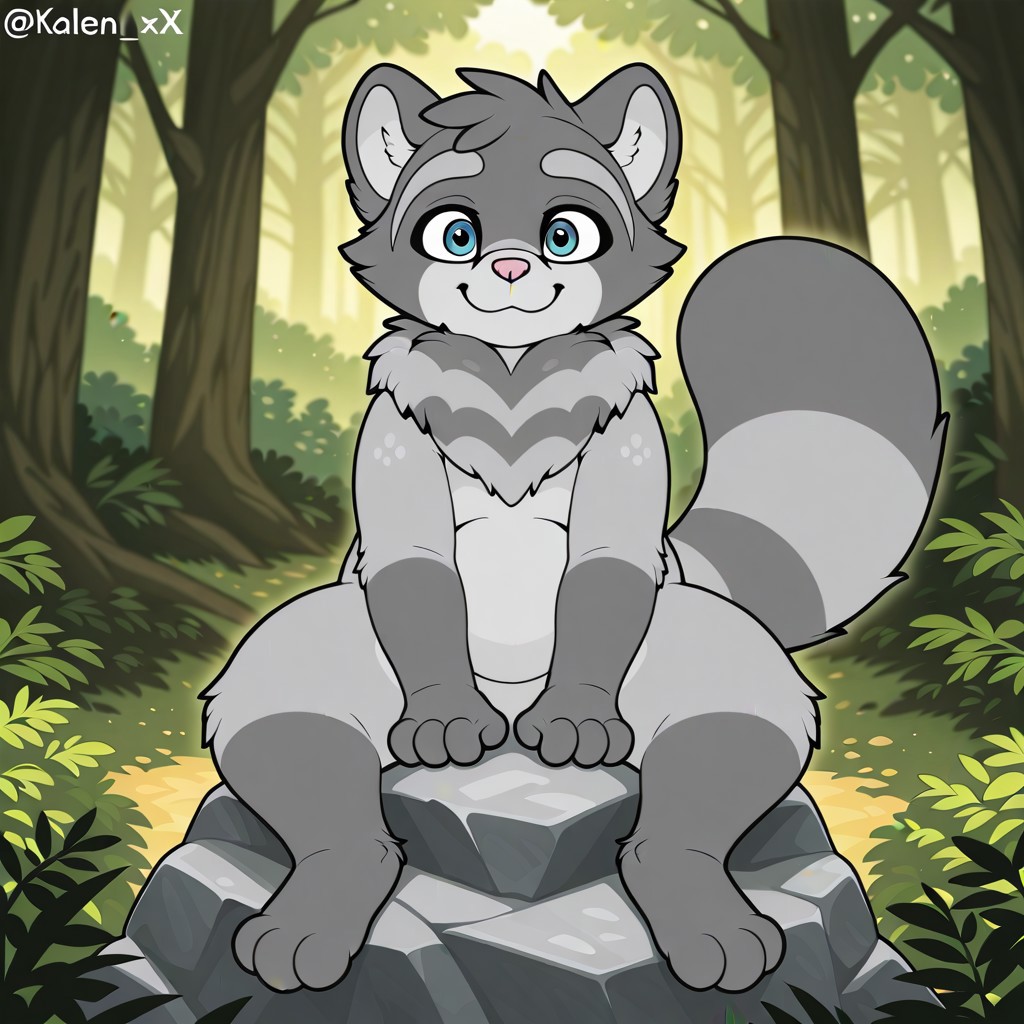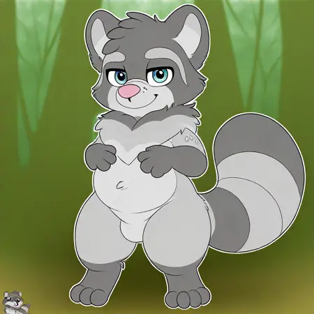 tanuki, raccoon, gray and black fur, blue eyes, pink nose, fur collar, raccoon tail, slightly chubby,