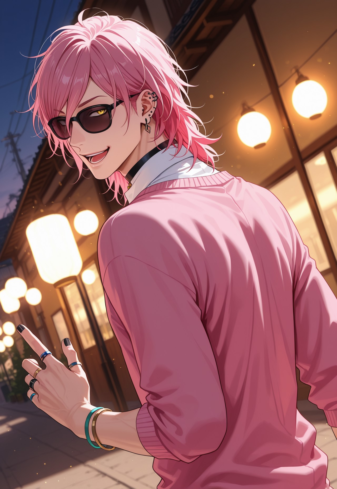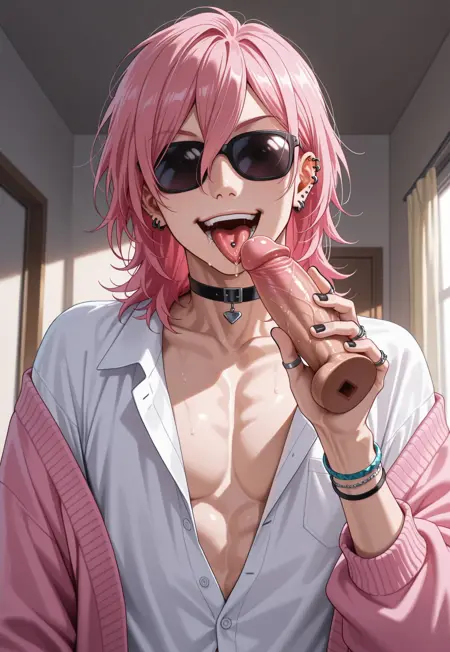 YBCYuri, 1boy, toned male, pink hair, medium hair, swept bangs, hair between eyes, multiple earrings, black nails,