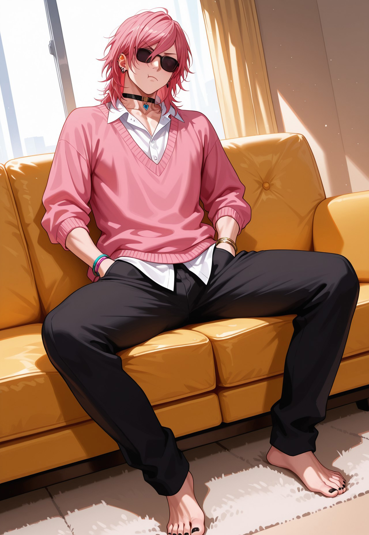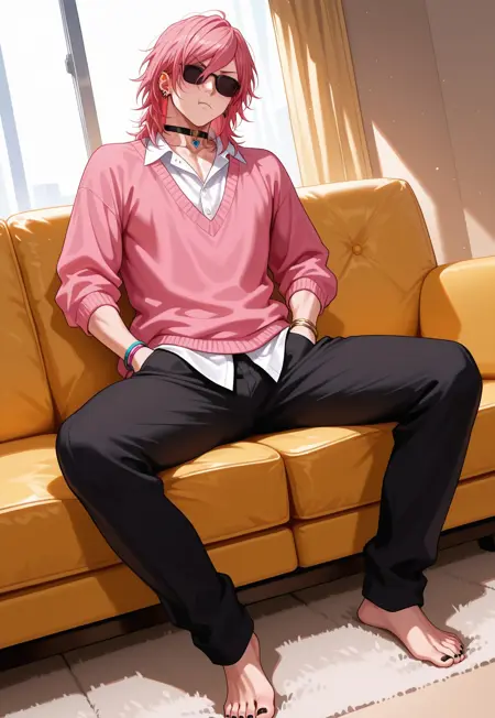 multiple rings, multiple bracelets, layered clothes, pink sweater, shirt under sweater, white collared shirt, open collar, untucked shirt, black pants, barefoot