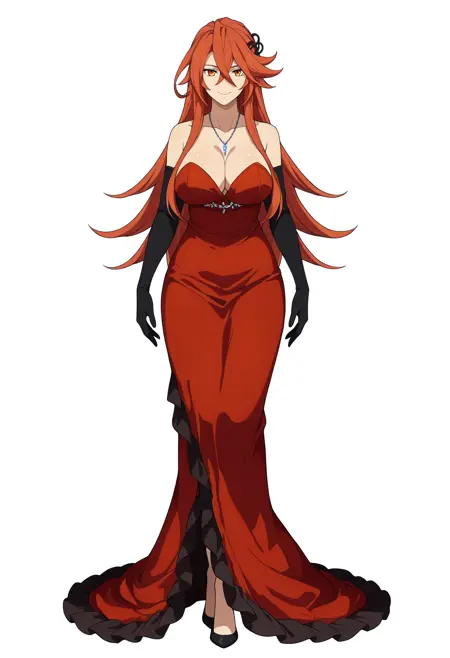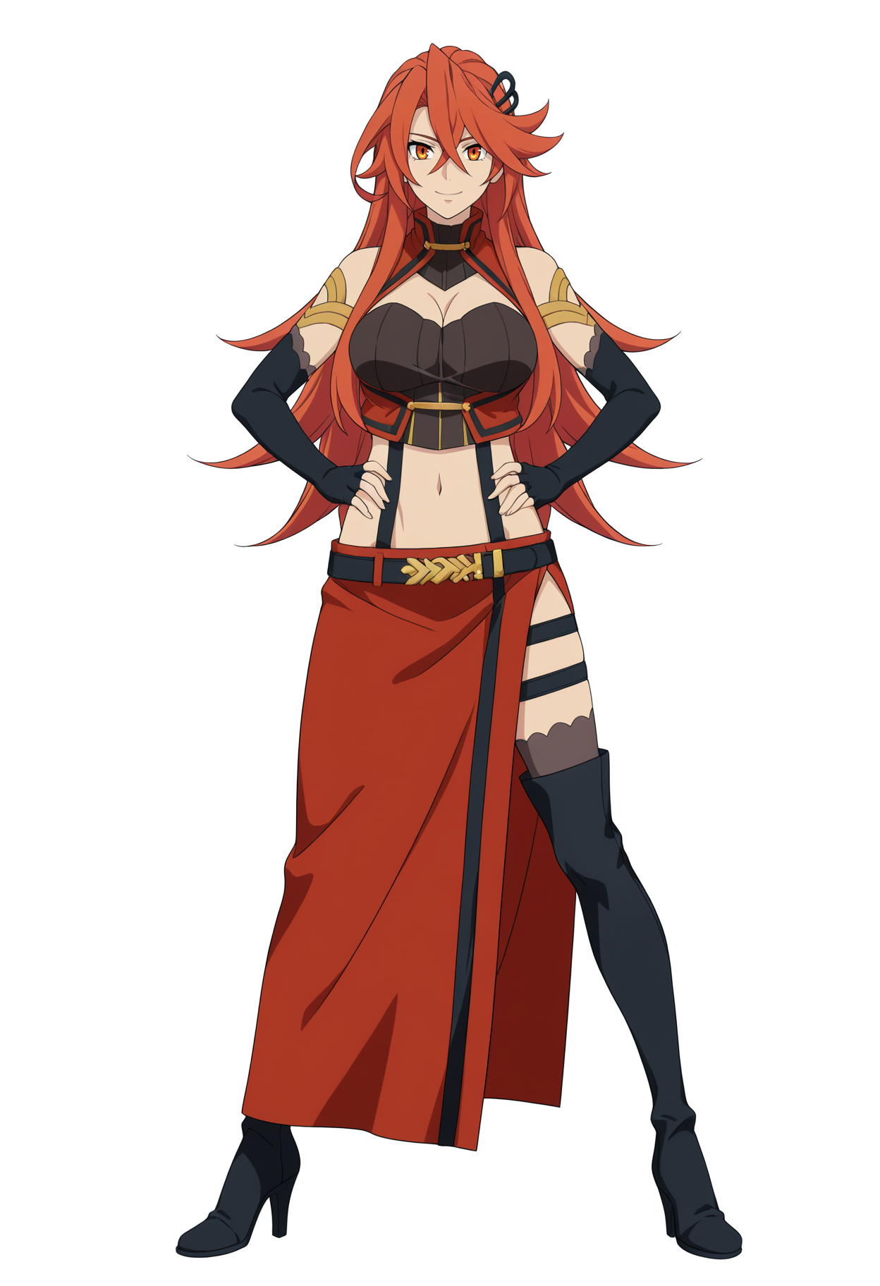 基础服装提示词:露胸,大乳房,短上衣,黑色肘套,红色裙子,露肩,侧开叉,肚脐,露腹,大腿靴,露指手套,高跟靴,过膝袜