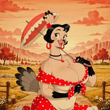 Pavita Pechugona,Anthro Turkey,Furry female,Beak,Light feathers,Black feathered arms,Short black hair,Necklace,red hoop earrings,Red and white dress,Curvy figure,Busty
