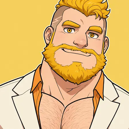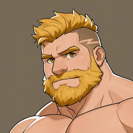 금발 머리, 금발 수염, 어두운 노랑과 주황색 눈
