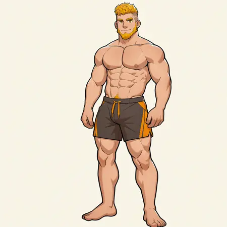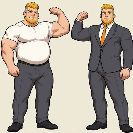그는 어깨가 넓고 근육질이며 약간의 배 지방을 가진 인물로 설정되어 있지만, 몸의 지방량은 어느 정도든 괜찮습니다.