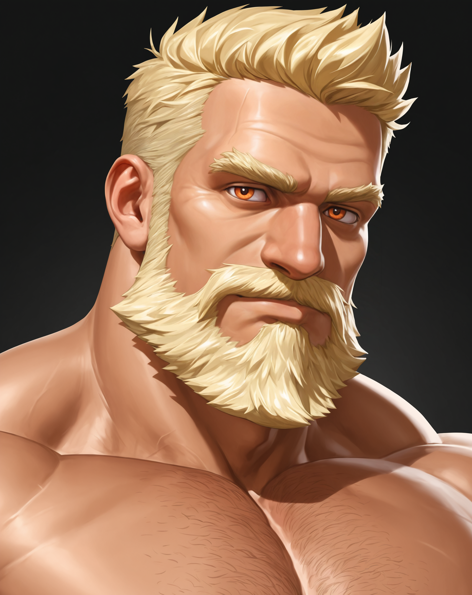 Blonde hair, blonde beard, dark yellow and orange eyes