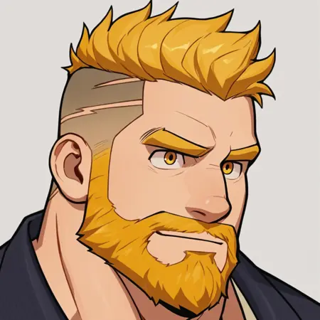 금발 머리, 금발 수염, 어두운 노랑과 주황색 눈