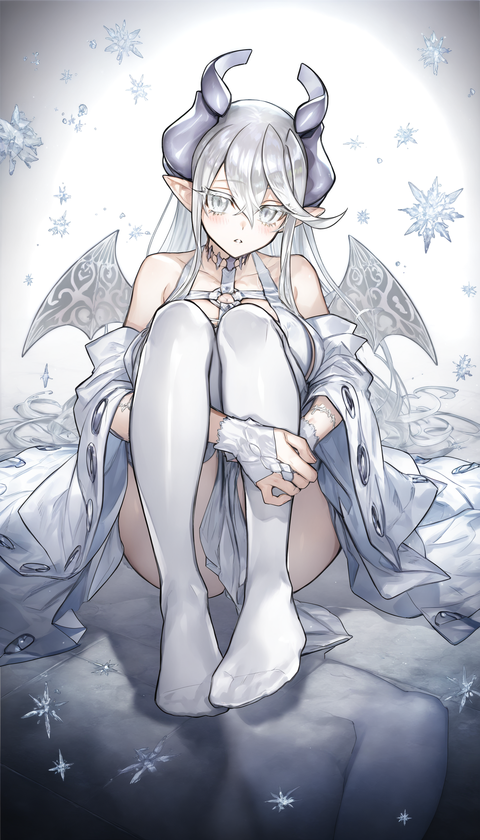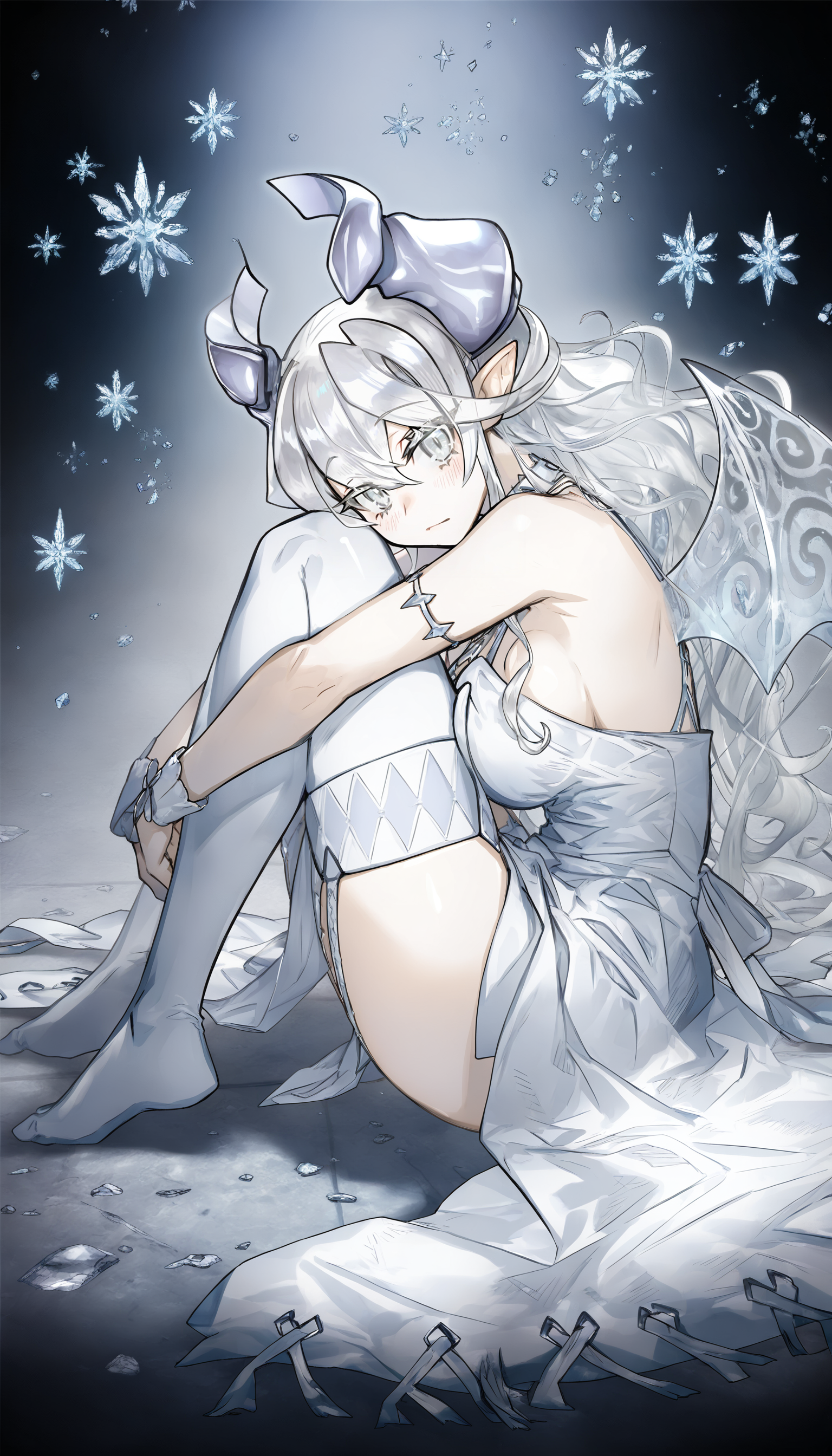 l2bryn7h, white hair,long hair,bangs,white eyes,horns,white halterneck gown,fingerless gloves,wings,white garter stockings,no shoes,