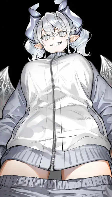 l2bryn7h, white hair,bangs,twintails,white eyes,horns,earrings,white sportswear with grey sleeves,grey sports pants,white leotard,