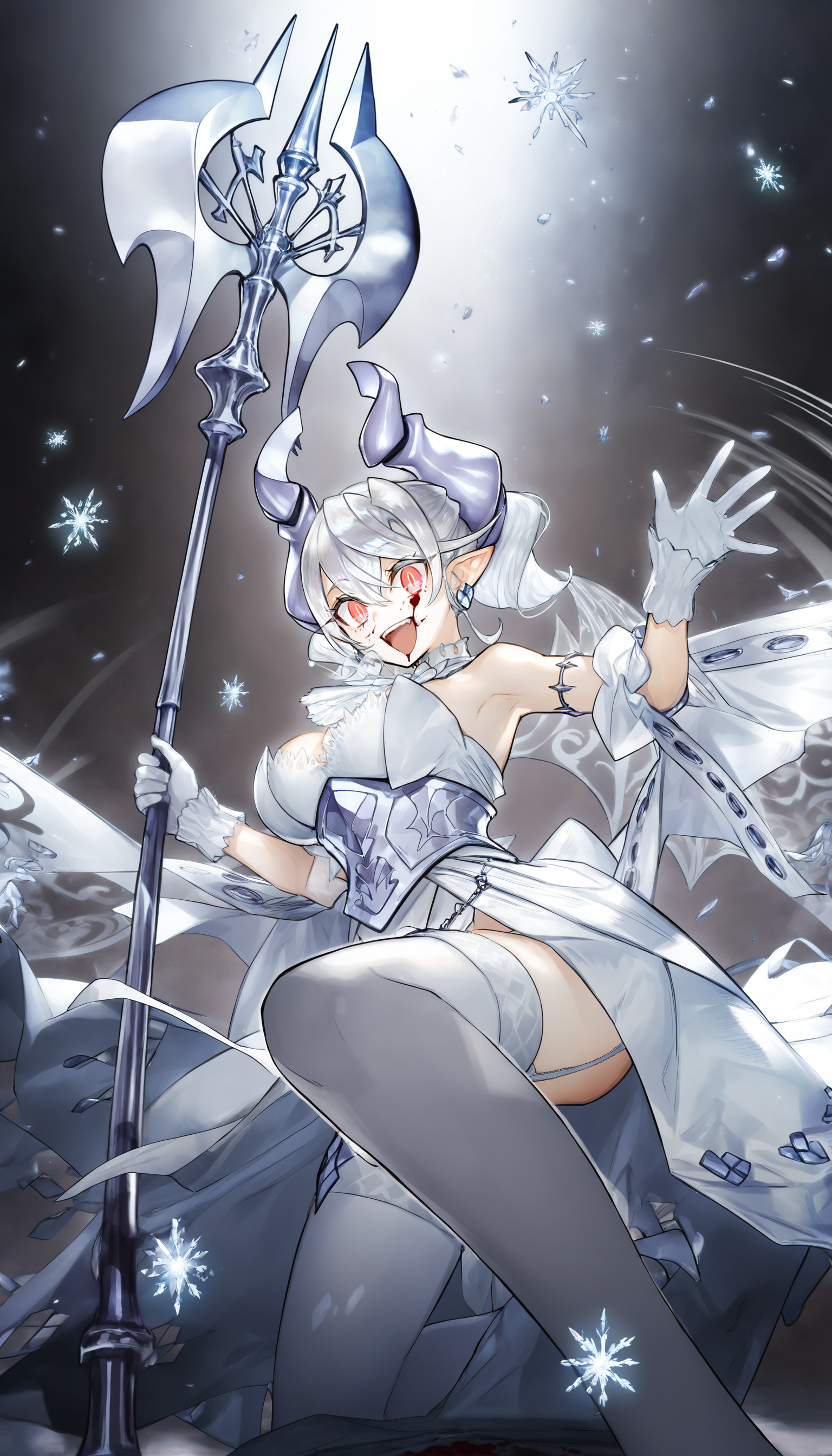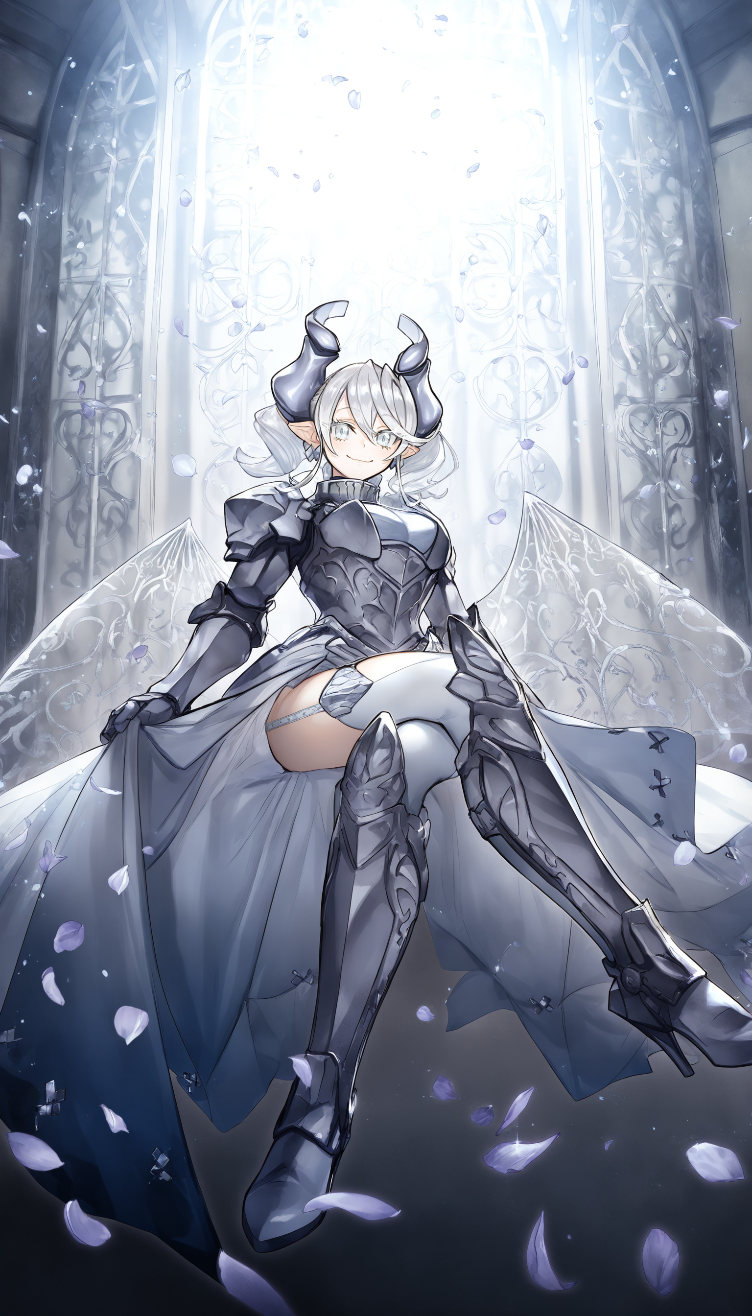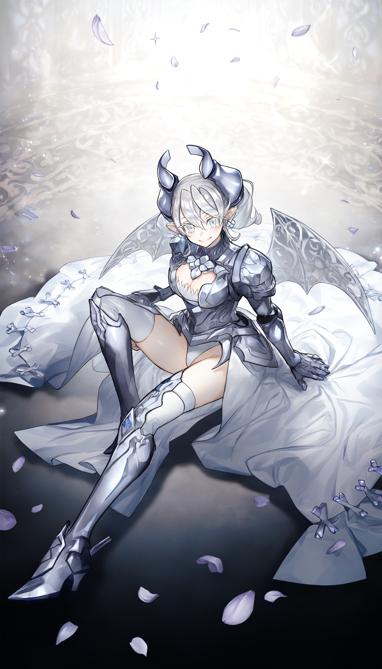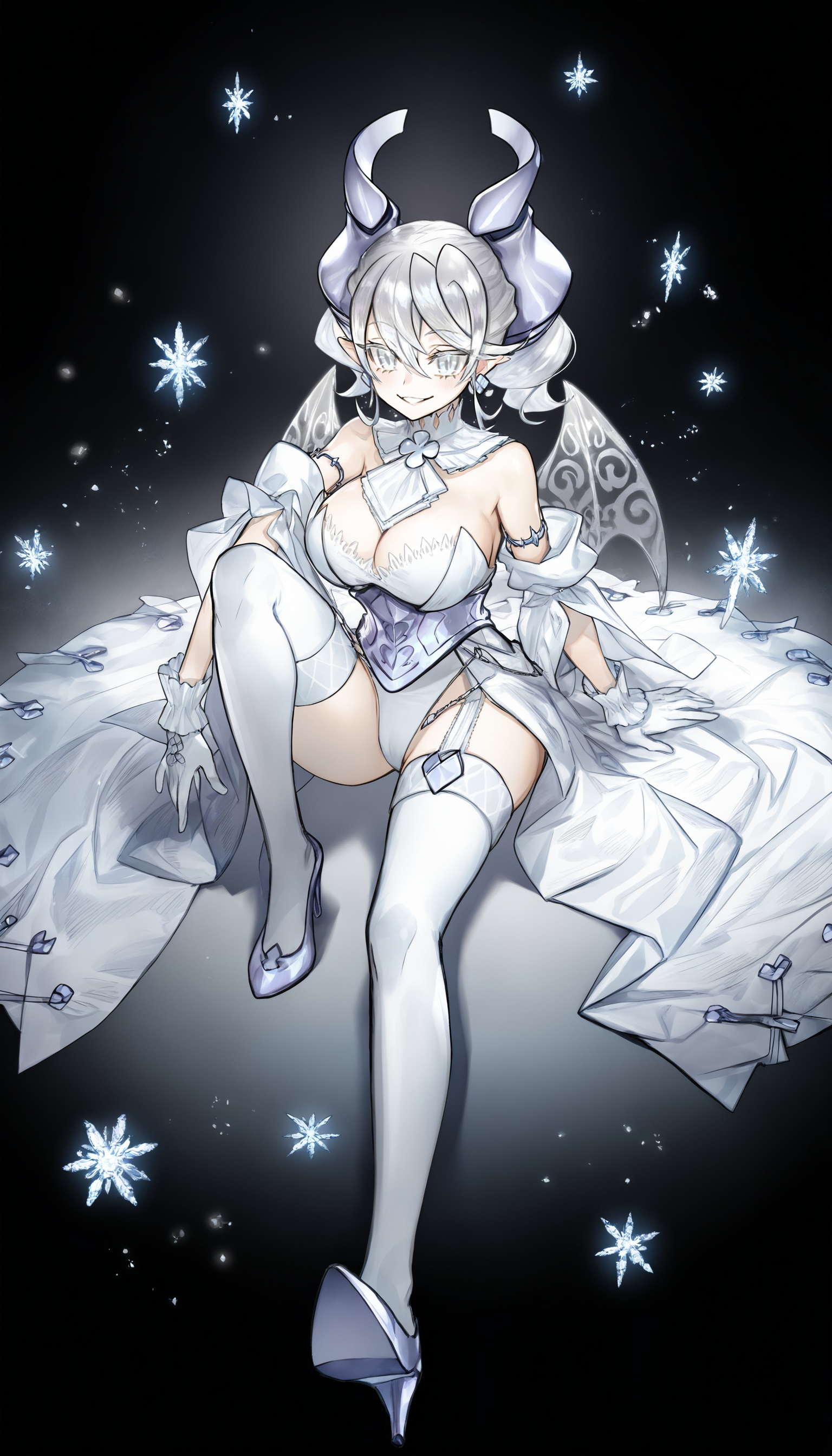 l2bryn7h, white hair,bangs,twintails,white eyes,horns,earrings,corset dress,waist armor,white leotard underneath,white gloves,detached sleeves,wings,white garter stockings,silver heels,