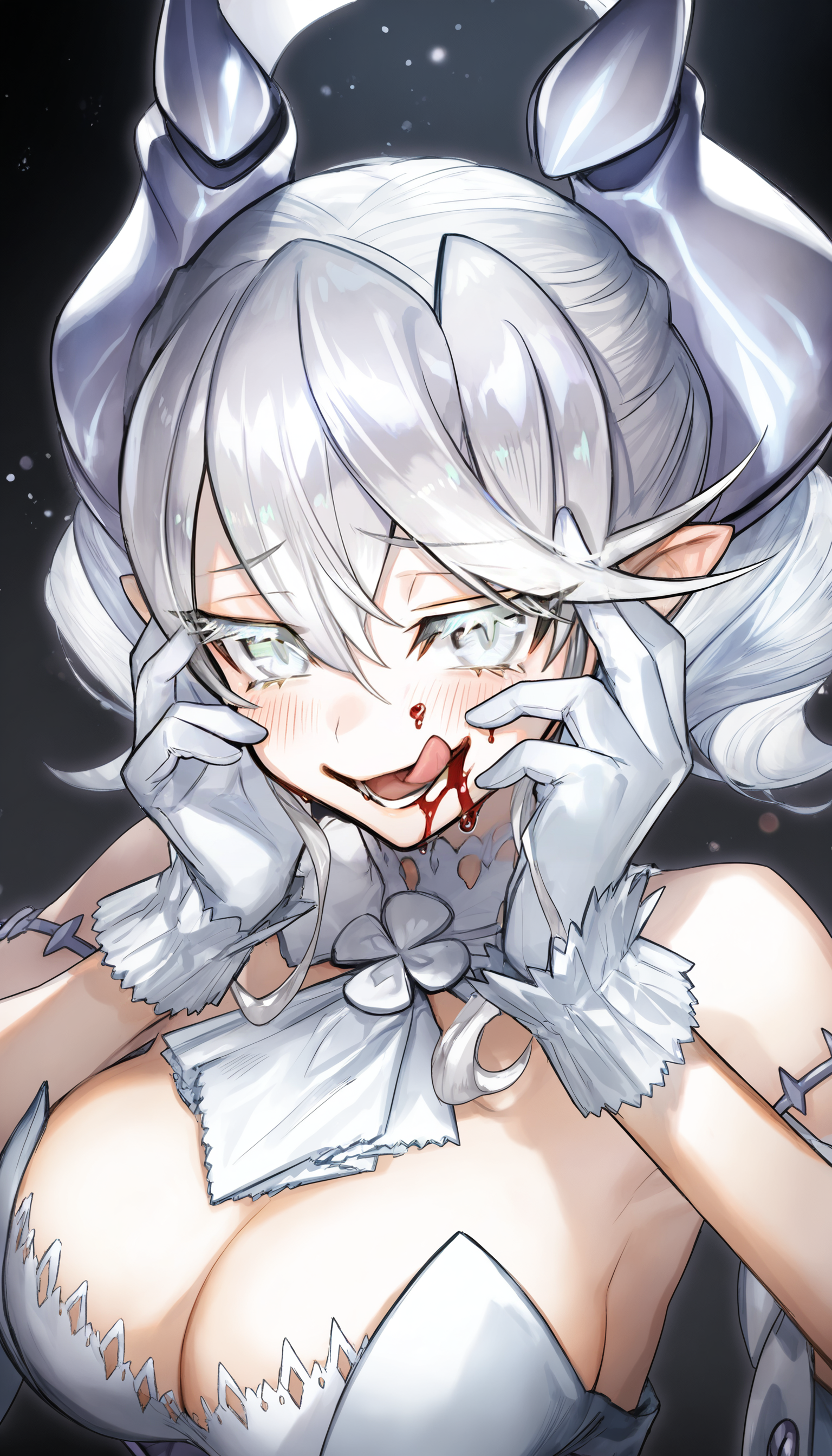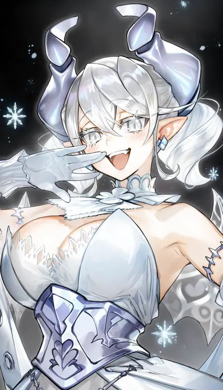 l2bryn7h, white hair,bangs,twintails,white eyes,horns,earrings,silver armor,cleavage,white leotard underneath,