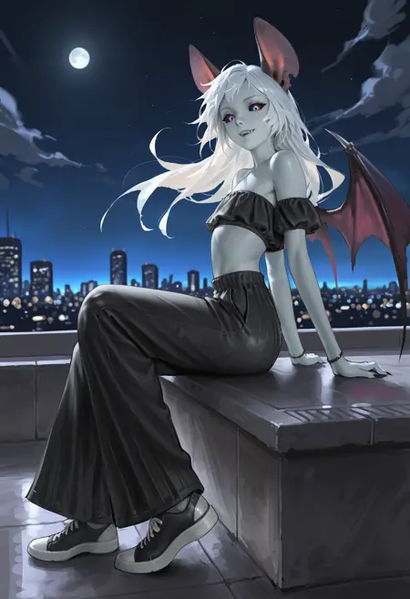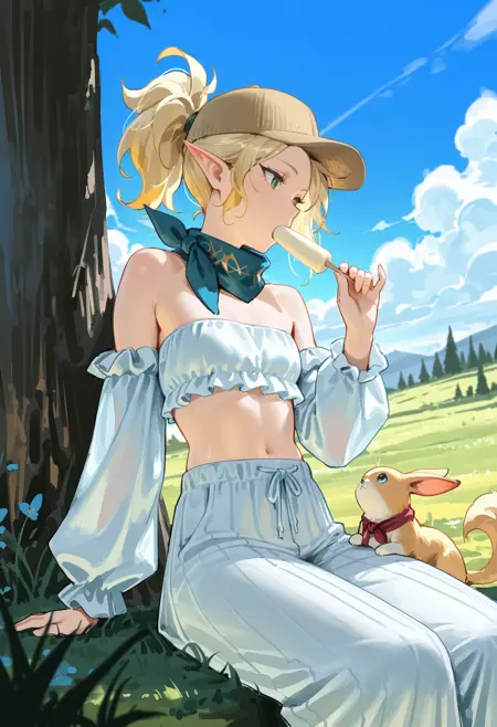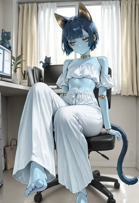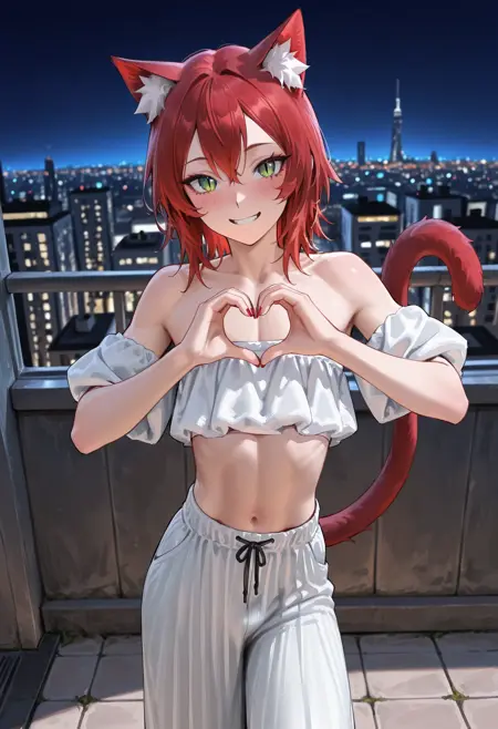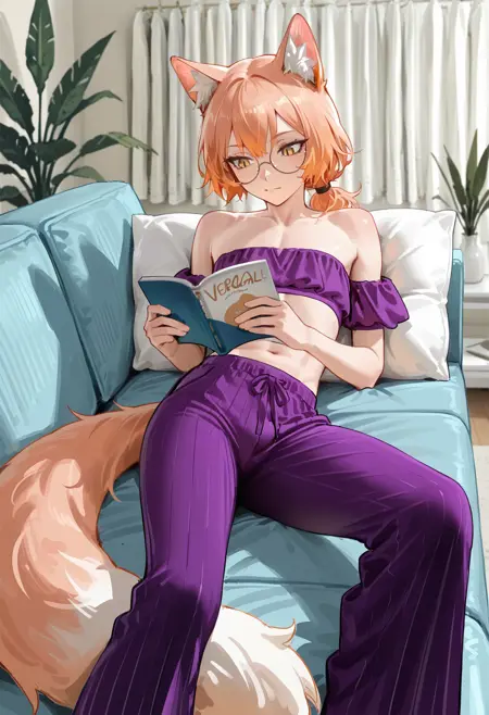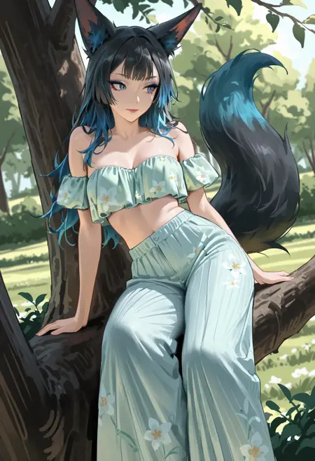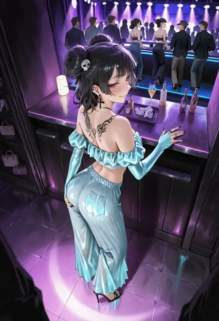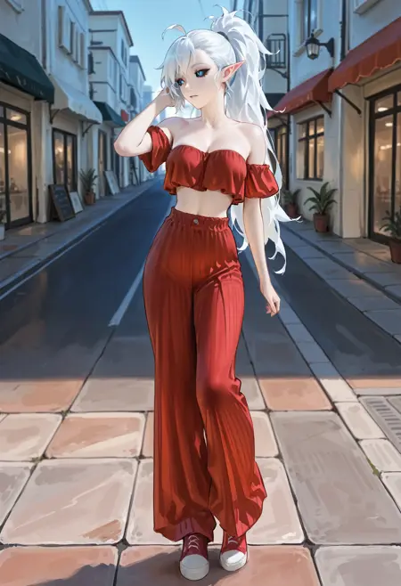 触发词:短上衣、露肩、短袖、露脐、褶皱裤、长裤、阔腿裤、荷叶边、无吊带、丝绸衣物,