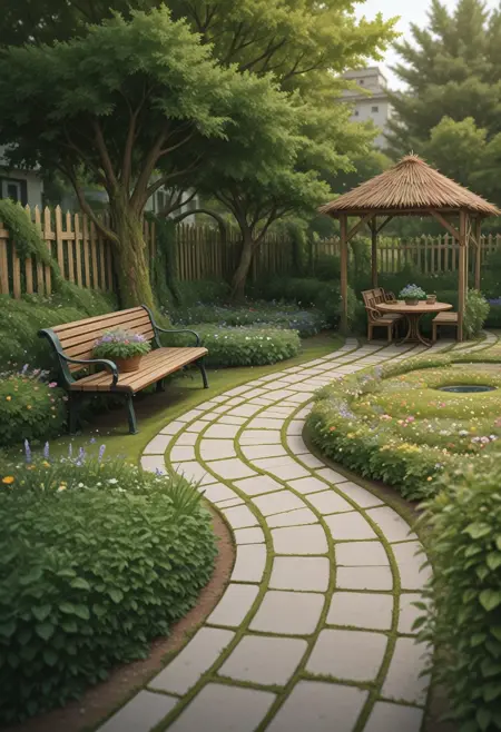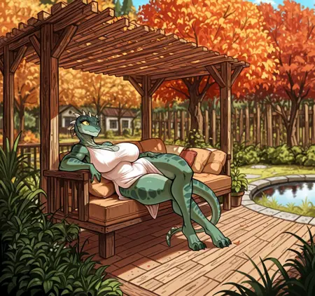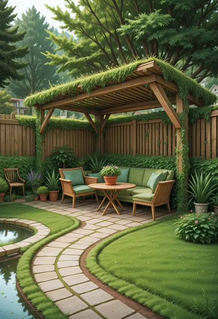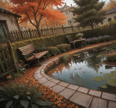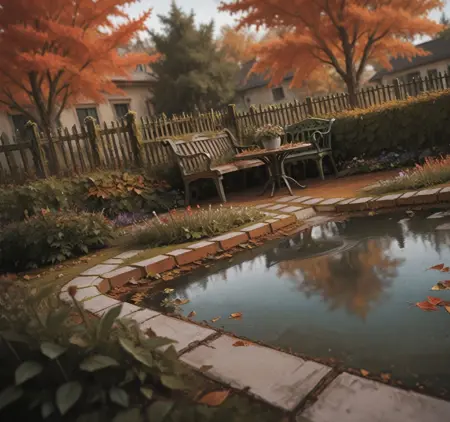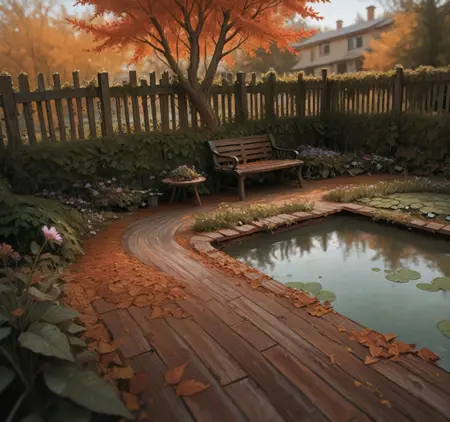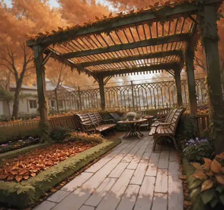 Other useful triggers: in a garden, in a small garden, pergola, winding path, flowerbed, potted plant, fence, overgrown fence, pond, grass, stone path, tree, chair, bench, table, string of lights, building, arch