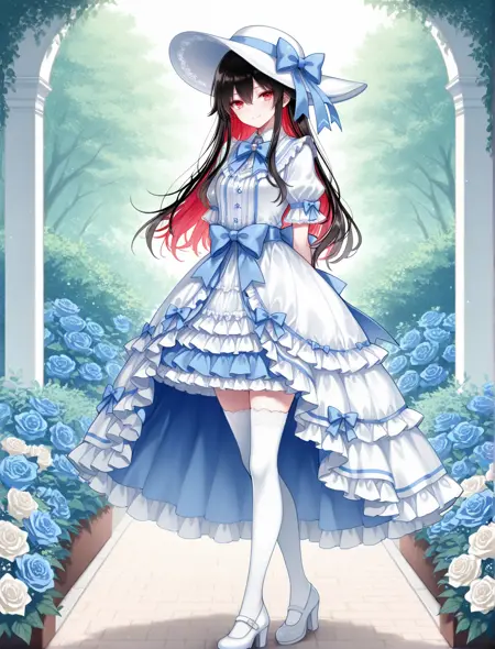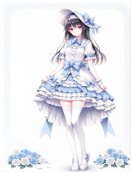 주름진 드레스, 계층적 드레스, 흰 장미, 허벅지까지 긴 양말, 장미, 꽃, 흰 꽃, 리본, 드레스, 흰 허벅지까지 긴 양말, 파란 리본, 흰 신발, 파란 장미, 파란 꽃, 모자, 짧은 소매, 흰 머리장식, 불룩한 소매, 하이-로우 스커트,