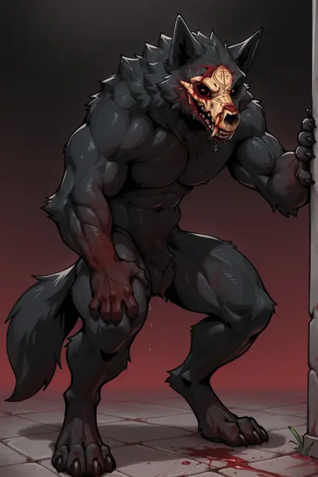 Wendigo: m3ph1st0, demon wolf, skull mask, black eyes, black fur, bloodied face, bloodied fur,