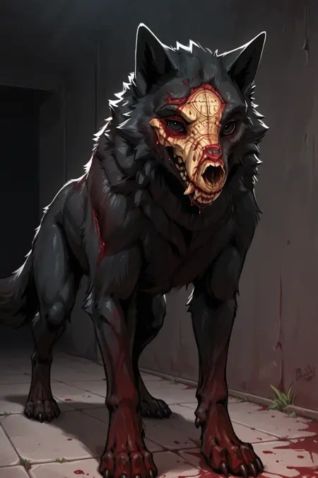 梅菲斯特:m3ph1st0,恶魔狼,黑色眼睛,黑色毛发,血迹斑斑的脸,血迹斑斑的毛发,