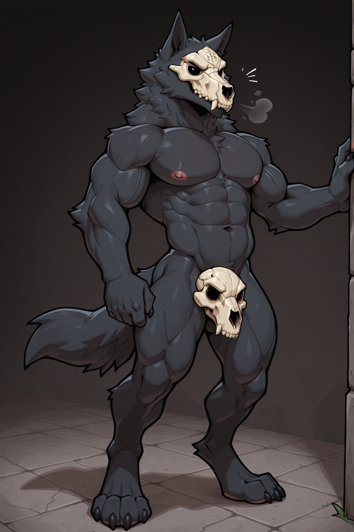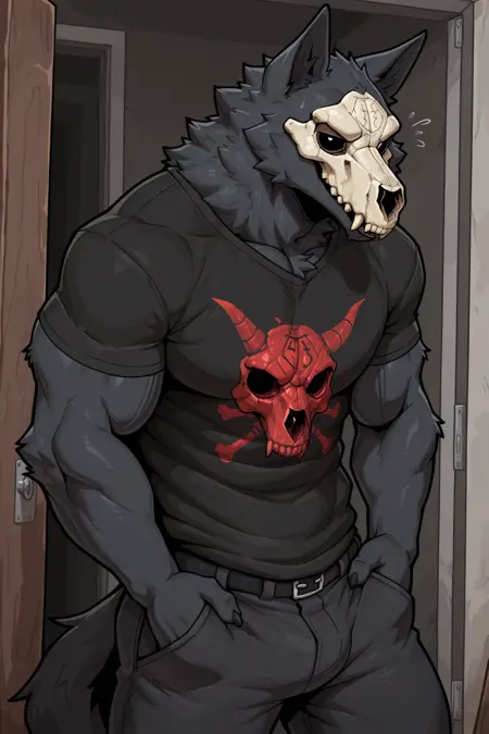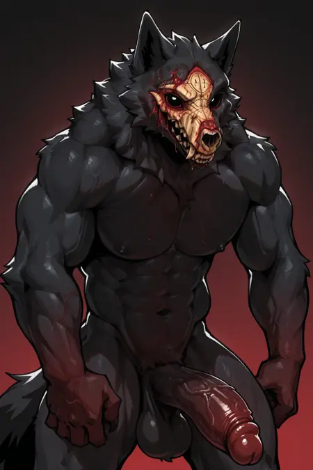 Wendigo:m3ph1st0,恶魔狼,骷髅面具,黑色眼睛,黑色毛发,血迹斑斑的脸,血迹斑斑的毛发,