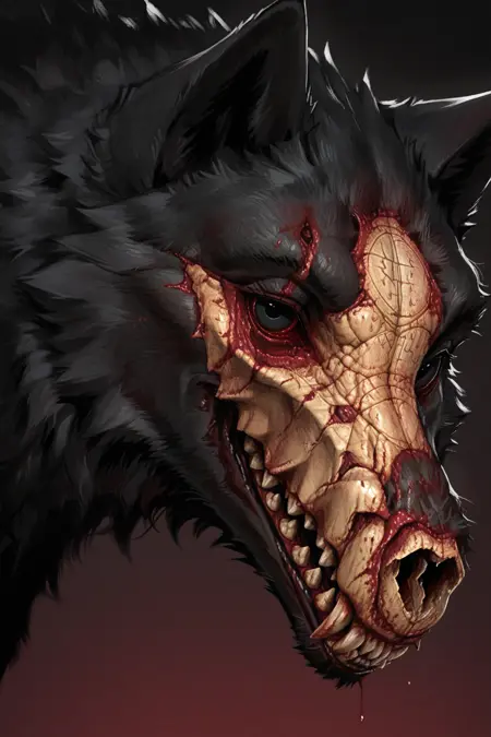 Mephiso: m3ph1st0, demon wolf, black eyes, black fur, bloodied face, bloodied fur,