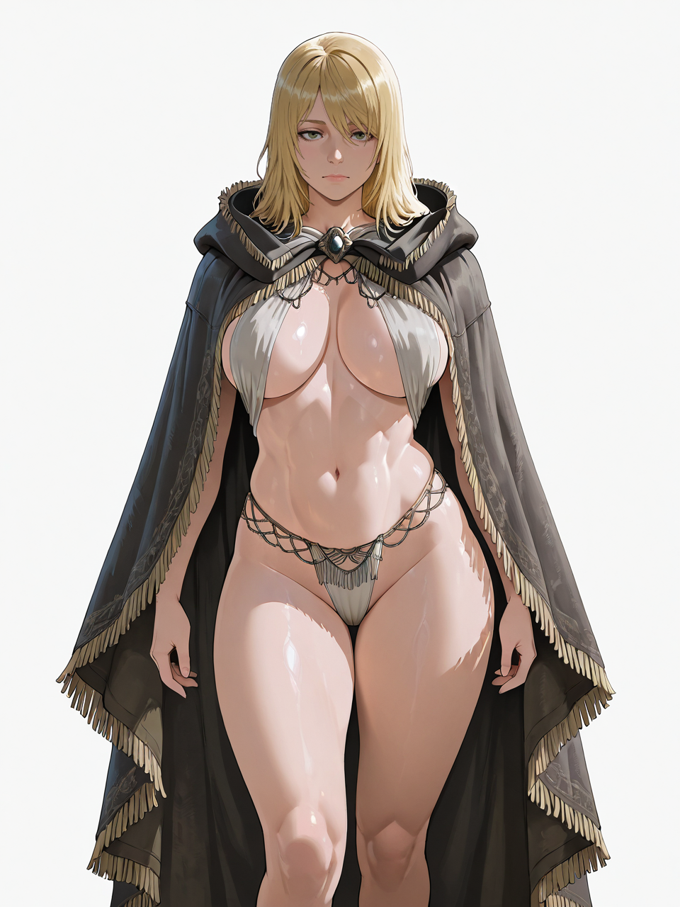 fia the deathbed companion \(elden ring\), green eyes, blonde hair, hooded cloak, black cloak, fringe-trimmed cloak, brooch, white panties, beaded panties,