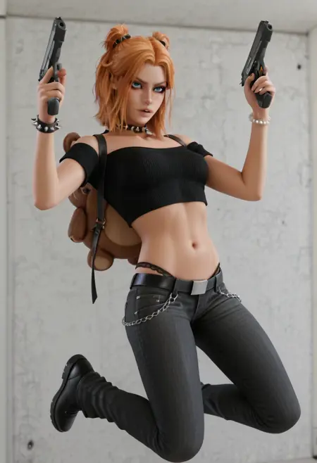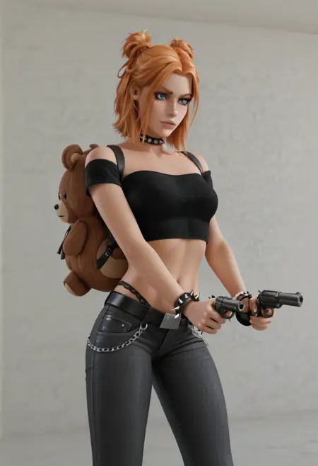 橙金色头发、两个凌乱的发髻、中分发型、蓝色眼睛、雀斑、淡妆、短上衣、低腰牛仔裤、牛仔裤上方可见内裤、毛绒熊背包、带尖刺手环、珍珠手环、配链条腰带。