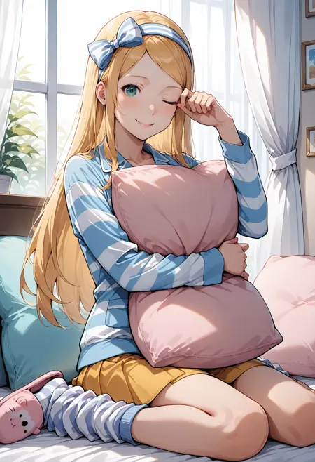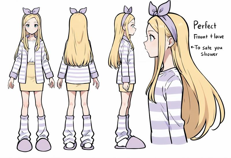 Home Outfit: hair ribbon,hairband,loose socks,slippers,striped,socks,long sleeves,bow,pajamas,hair bow,ribbon,skirt,yellow skirt,leg warmers