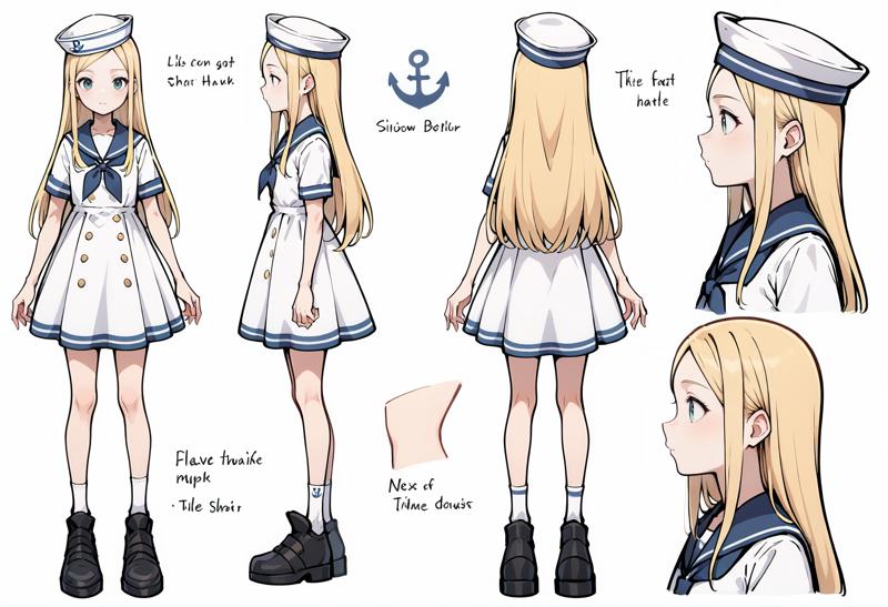 Sailor dress Outfit: hat,sailor hat,military hat,anchor symbol,sailor collar,sailor dress,dress,socks,shoes,blue sailor collar,sailor,short sleeves,black footwear,anchor print,white socks,white dress,buttons,shirt,neckerchief