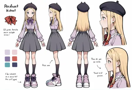Causal dress Outfit: bangs,hat,beret,skirt,purple footwear,black headwear,shirt,black skirt,socks,long sleeves,bow,purple bow,ribbon,shoes,bowtie,frills,black socks,purple ribbon,purple shirt,red ribbon,red bow,purple bowtie,buttons,grey skirt,pink footwear,blouse