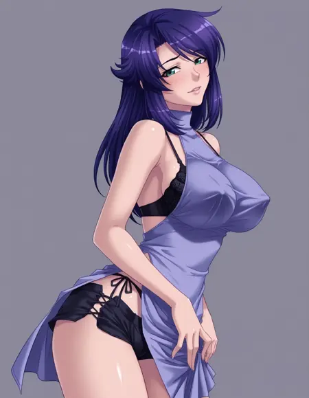 mai_turtleneck_dress,purple_dress,black_bra,black_shorts,bare shoulders
